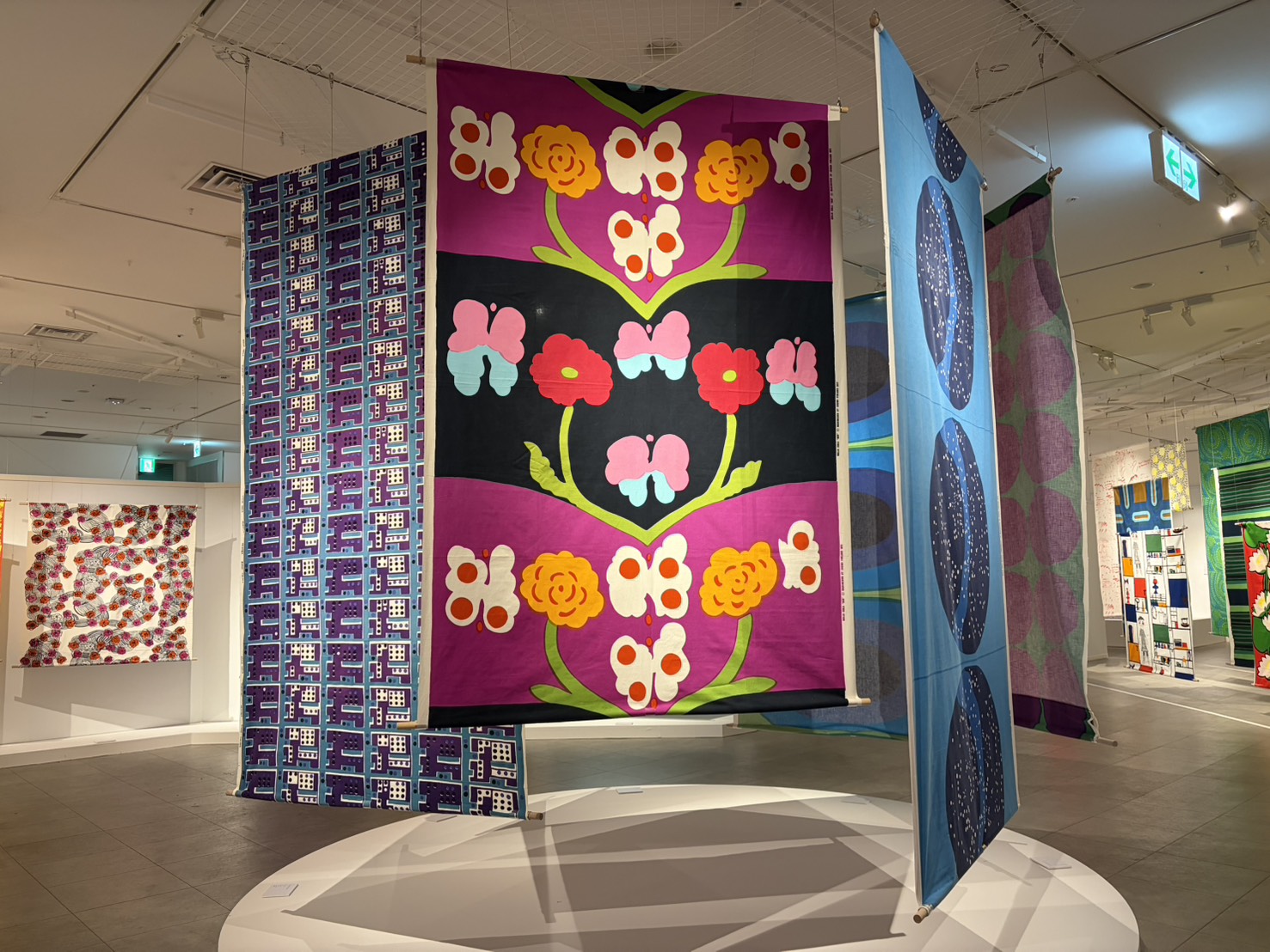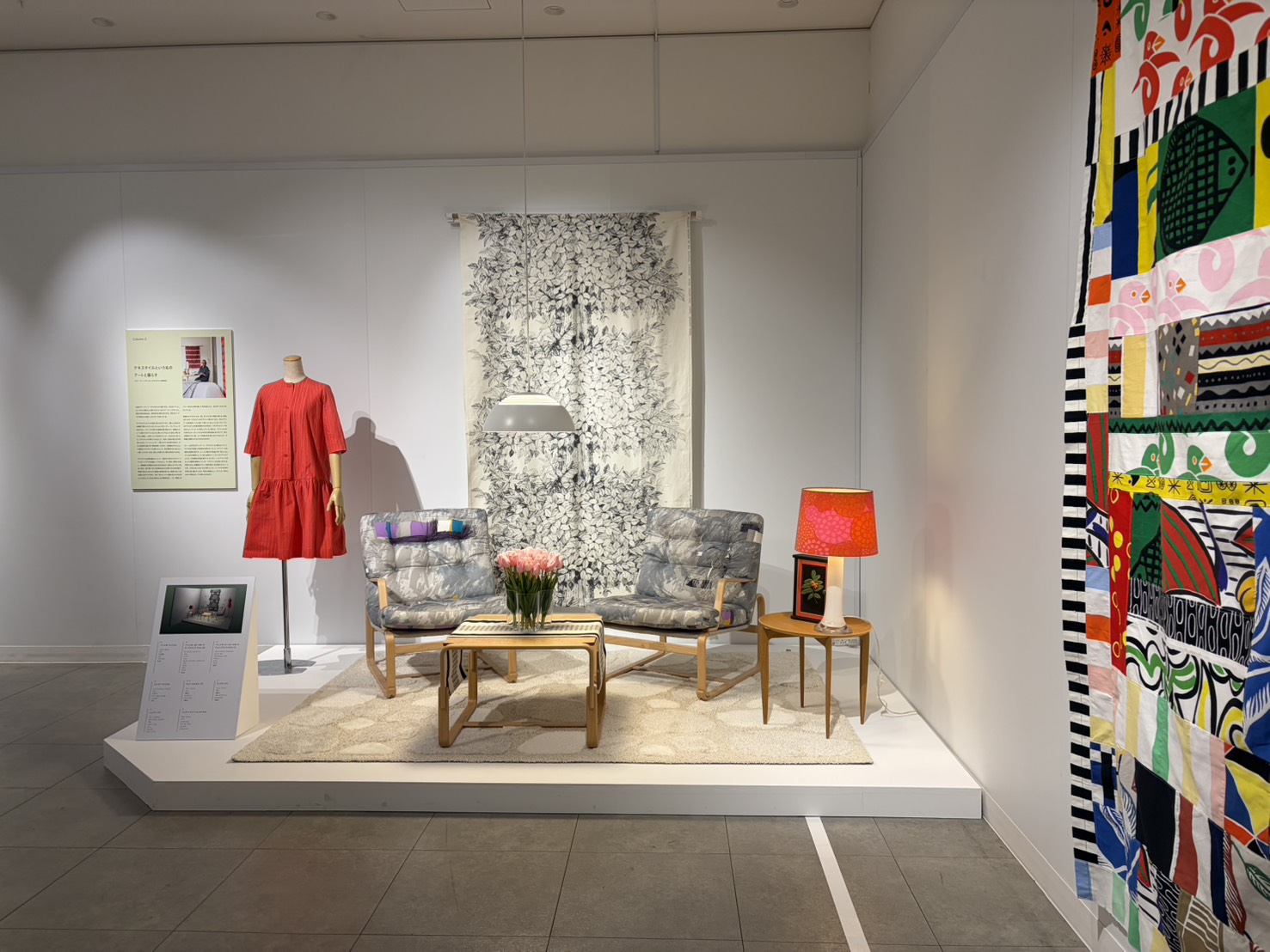 会場に一歩足を踏み入れると、そこには北欧の自然を思わせる柔らかな光と鮮やかな色彩が広がっています。単に布を鑑賞する場ではなく、北欧の人々が厳しい冬を豊かに過ごすために育んできた「暮らしの知恵」を追体験ができる展覧会です。