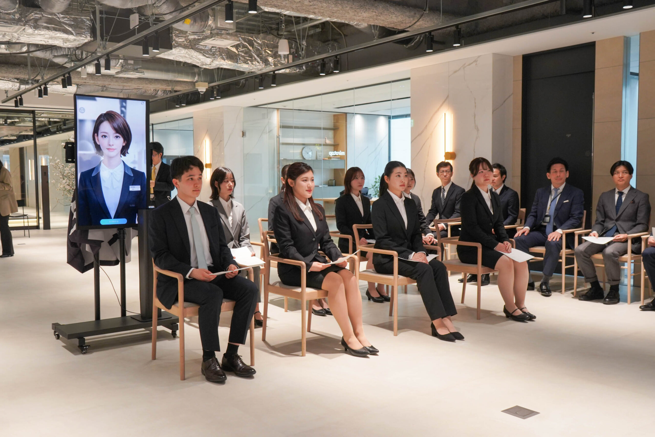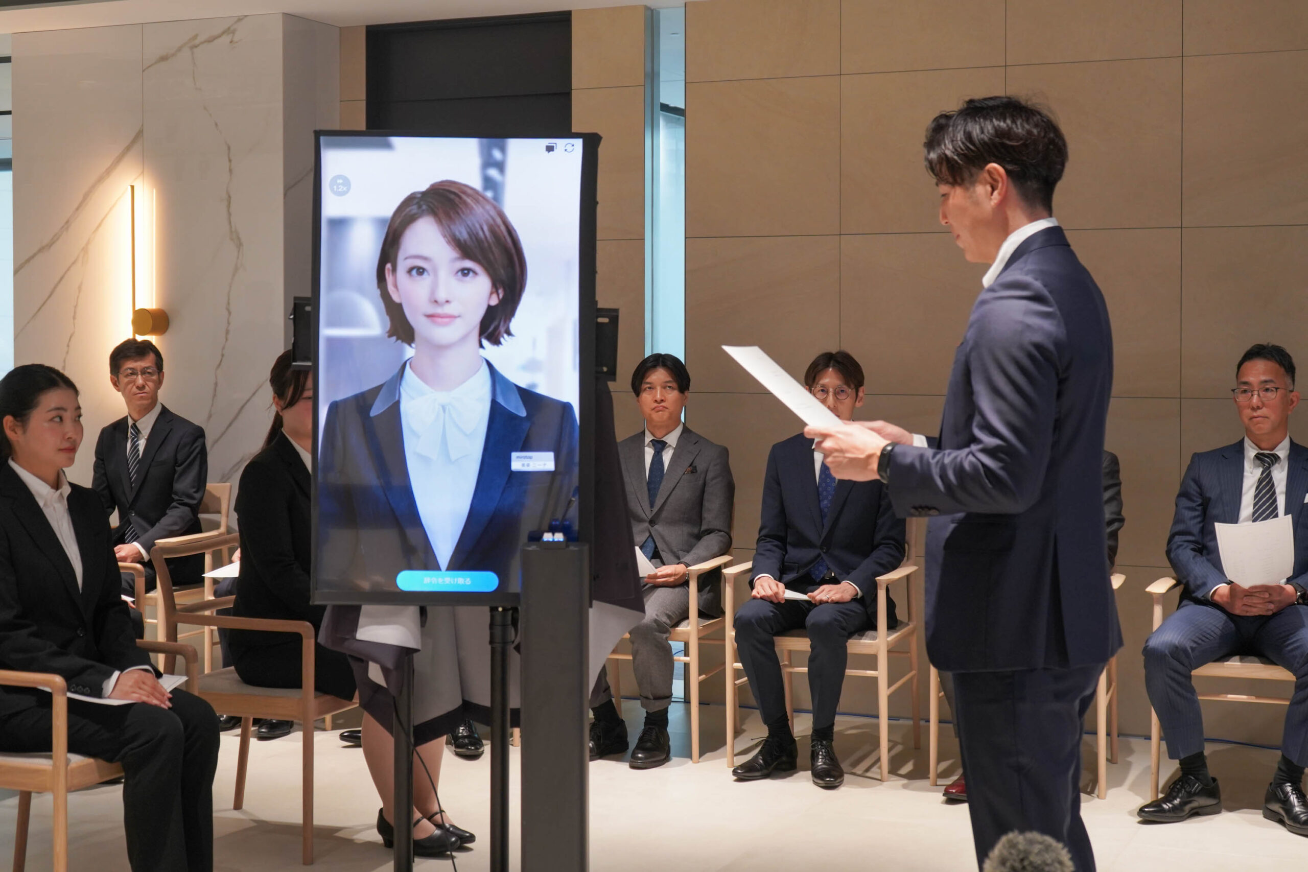 入社式では、モニター越しに紹介されたニーナさんが新入社員の列に並び、これからの「人とAIが協働する」新しい働き方を予感させるひと幕もありました。